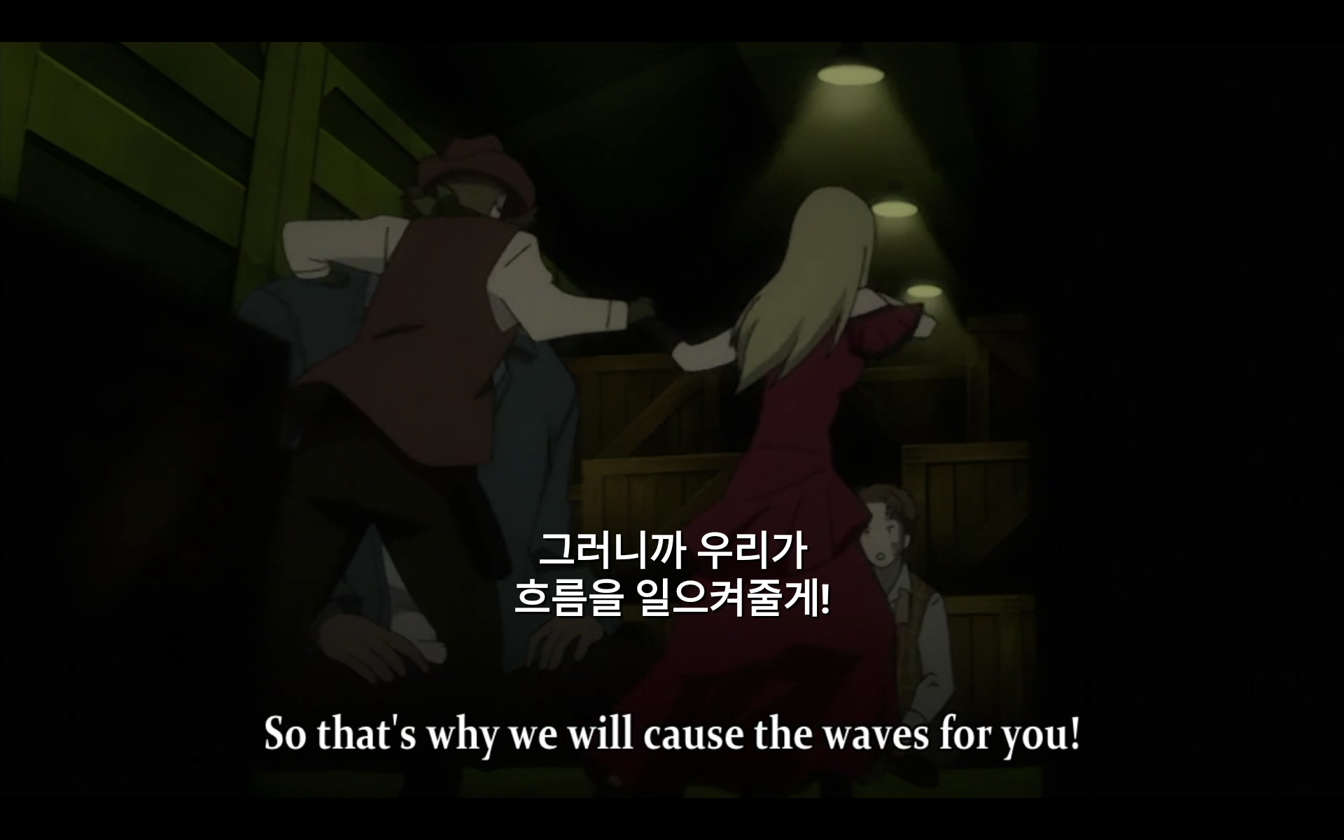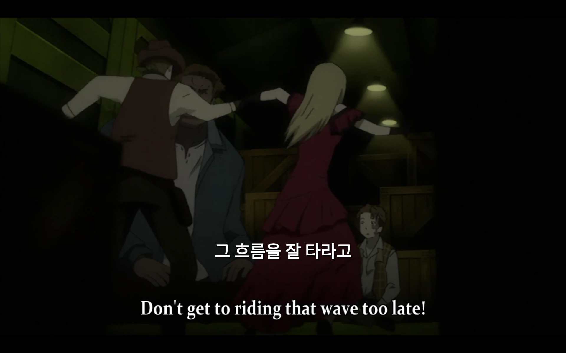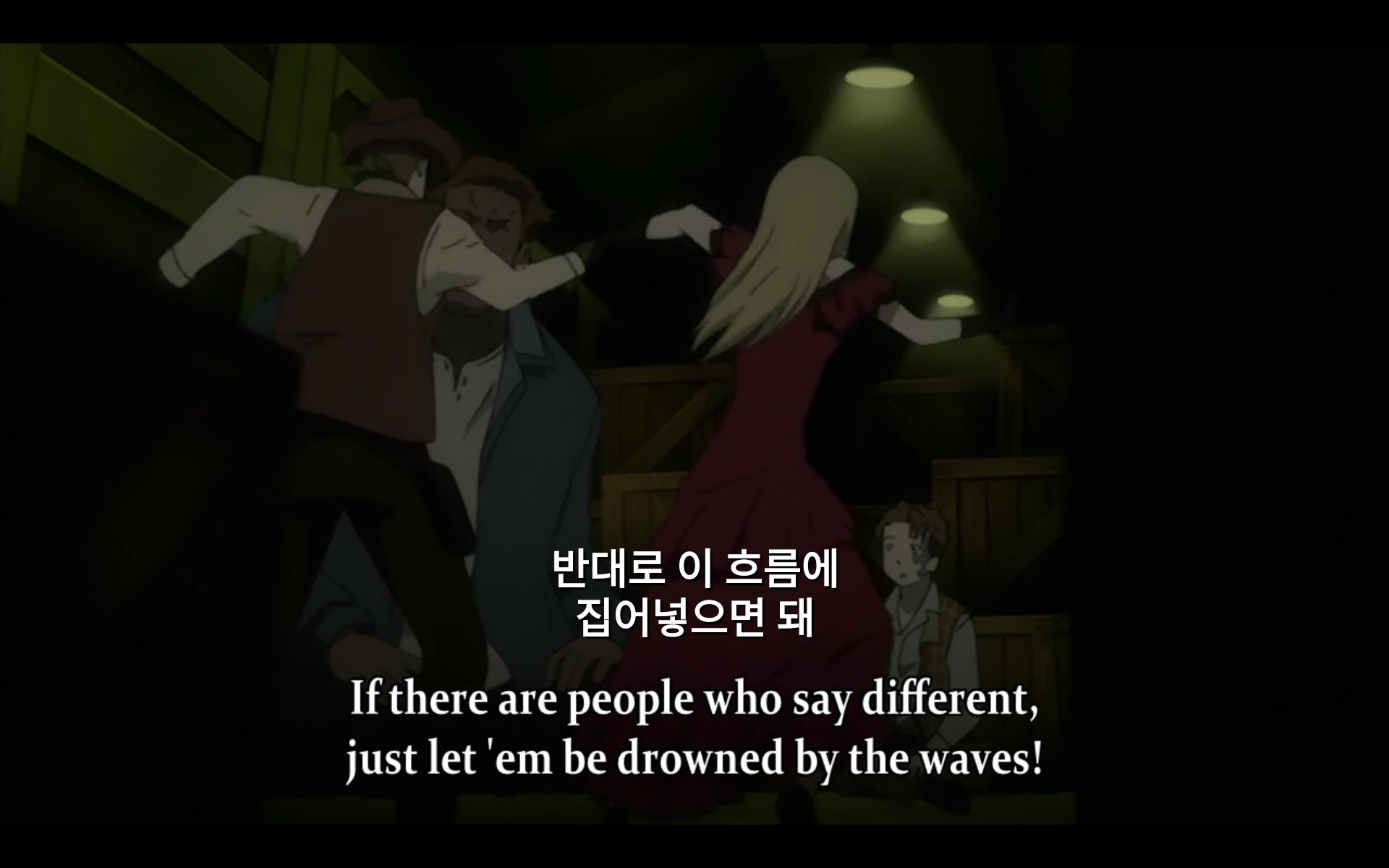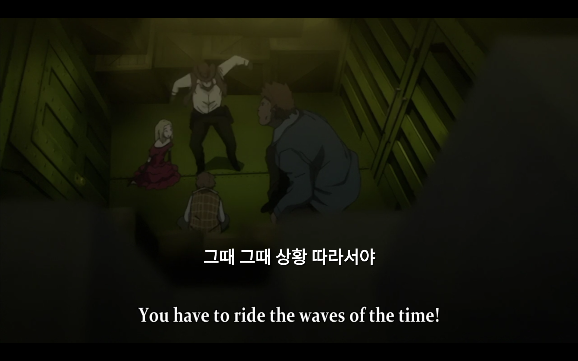 #Baccano 라는 애니메이션을 보고 있습니다. 영상립에 영어 자막이 같이 딸려왔는데, 이걸 보면서 역시 일본 애니메이션의 영어 자막에는 한계가 있는게 아닐까 생각하게 됩니다. 아래 이미지들은 그 예시인데, 원어가 뭔지는 몰라도 “흐름을 탄다”라는 표현을 옮기지 못해서 직역을 해버린 케이스입니다. 그 밖에 삼국지의 주역을 “조조와 유비 그리고 호쿠사이”라고 얼버무리는 미니개그 감각이 전달이 안 될 것 같다라던지 (설마 영어권 애니 수요층이 삼국지를 알지는 않겠지!).. 이점에 대해서는 한번 설파한적이 있는데 다시 생각해보면 한국어 문화권은 일본 문화를 향유하기에 타고난 지리적 조건을 가지고 있다는 생각이 듭니다. 이질적으로 느껴질만큼 떨어져 있지만 다른 문화권들과 비교했을 때 가장 인접해 있기 떄문에 뉘앙스나 맥락 같은것을 쉽게 캐치할 수 있기 때문에..
